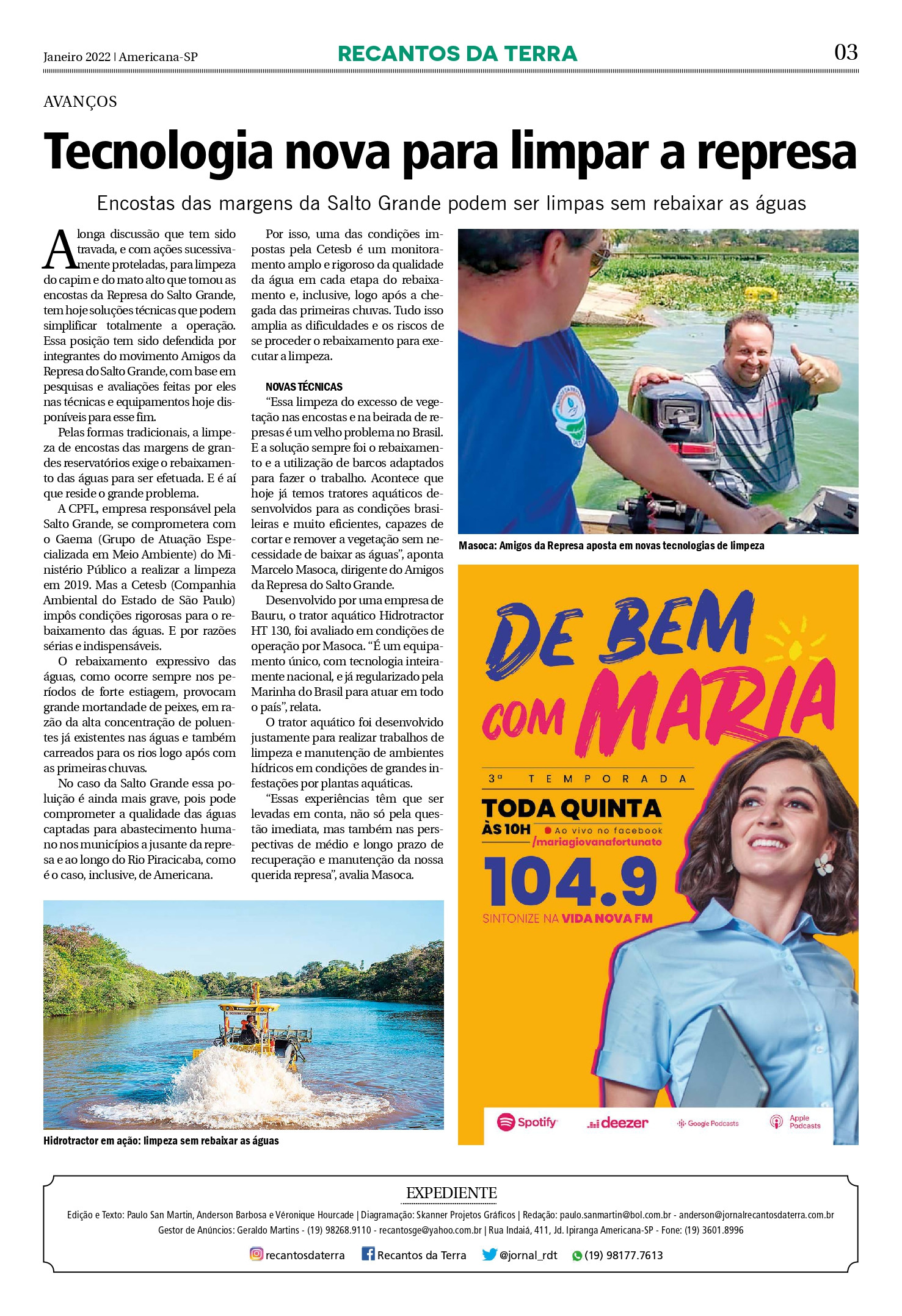 “Essa limpeza do excesso de vegetação nas encostas e na beirada de represas é um velho problema no Brasil. E a solução sempre foi o rebaixamento e a utilização de barcos adaptados para fazer o trabalho. Acontece que hoje já temos tratores aquáticos desenvolvidos para as condições brasileiras e muito eficientes, capazes de cortar e remover a vegetação sem necessidade de baixar as águas”, aponta Marcelo Masoca, dirigente do Amigos da Represa do Salto Grande.