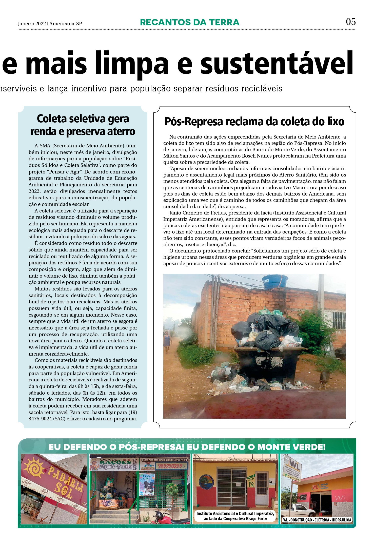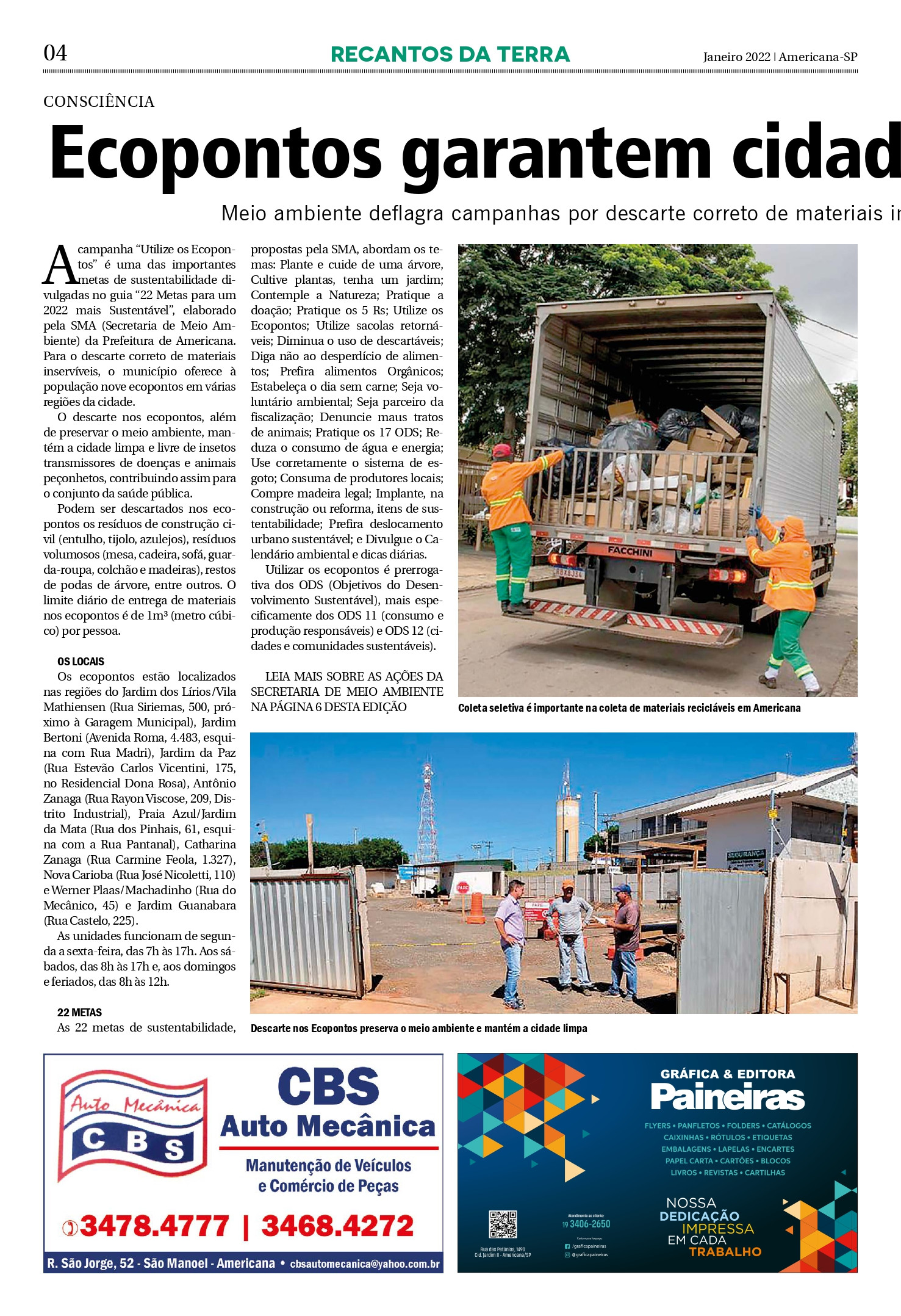 A campanha “Utilize os Ecopontos” é uma das importantes metas de sustentabilidade divulgadas no guia “22 Metas para um 2022 mais Sustentável”, elaborado pela SMA (Secretaria de Meio Ambiente) da Prefeitura de Americana. Para o descarte correto de materiais inservíveis, o município oferece à população nove ecopontos em várias regiões da cidade.